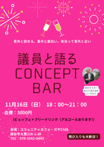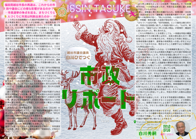 Re Design民主主義 対話から始めよう! 2023.01.192025.11.09 TikTok 読者会ニュース53号 2025.11.06 一心太助の天秤棒_2025年8月-159号 2025.11.06 一心太助の天秤棒_2025年8月-158号 2025.11.06 読者会ニュース52号 2025.08.24 一心太助の天秤棒_2025年8月-157号 2025.08.24 活動毎日、毎朝の駅立ち(AM6:00~AM8:30)と定期的な夜の駅立ち(PM7:00~PM12:00)は21年目に入る。(通算4300日を超える)せんげん台東・西、大袋東・西、北越谷東・西、越谷東・西、新越谷東・西、蒲生東などを順次。市政報告会や政治課題等をテーマに市民を対象に随時タウンミーティングを開催し、130回を超える。市政レポート毎月作成、街頭、地域で配布。 毎年新年3か日(元旦、2日、3日)は、越谷市一円で街頭市政報告会を新年あいさつを兼ねて開催。 1年の活動のスタートとしている。当選以来実施しており、19回となる。 市政レポートで日常活動を報告する「一心太助の天秤棒」(毎月発行し117号まで駅立ち等で配布)、 年4回の議会終了後定期発行する「一心太助 幕政に物申す」(86号まで発行、配布) 議会終了後超党派議員で構成する「議員有志の会」(7名)で市政報告会を提起開催。 (2023年1月1日現在) 役職「がんばろう、日本!」国民協議会同人ローカルマニフエスト推進地方議員連盟監事越谷総合技術高校PTAOB樟の木会会員中小企業家同友会会員埼玉政経セミナー 会員 家族妻、2男、1女 連絡埼玉県越谷市下間久里477-12048-979-3023221 昭和28年佐賀県に生まれる昭和50年福岡大学経済学部卒業。福岡県議事務所勤務昭和58年福岡市議会議員に29歳で立候補したが惜敗昭和62年福岡市議会議員(最年少当選)を一期勤める平成05年衆議院秘書として、日本新党細川政権を支え国会事務所で活動平成07年埼玉県に転居、保険代理店勤務平成11年越谷市議選挙に立候補、2,060票の支持を得たものの、5票差で次点となり落選平成13年岩槻タクシー乗務員。変則的勤務時間を活用しながら「がんばろう、日本!」国民協議会の一員として、主権者運動を始める。日本再生のエネルギーは、バッチをつけない主権者一人一人の小さき無償の戦いから生まれることを確信。平成15年越谷市会議員当選 1期目 2709票(13位)平成19年越谷市会議員当選 2期目・副議長 3253票(7位)平成23年越谷市会議員当選 3期目 3478票(3位)平成27年越谷市会議員当選 4期目 3805票(3位)平成31年越谷市会議員当選 5期目 4143票(4位) 一灯を掲げ一隅を照らす。暗闇を恐れることなく、一灯を保つ。自由、民主主義、開かれた市場経済、基本的人権という近代が勝ちとってきた普遍的価値を、自らのアイデンティティにまで高め、深化するためには、連続的戦いが伴います。○ この平成の開国倒幕という時代の荒波に漕ぎ出すエネルギーは、 国民主権の「草莽掘起」によって蓄積・発展し、政党政治の基盤を打ち固めます。○人口減少時代とグローバル市場に機敏に対応することが矜持ある日本を創造して行きます。○ 出でよ草莽の転轍手、国民主権のせり上がりのなかで、「保守したければ改革せよ」。 今私たちの社会は大きく変ろうとしています。ロシアのウクライナ侵攻は、遠い国の話ではなく、私たちのすぐ目の前にある脅威として、国の姿勢を問うています。新型コロナウィルス感染に対する対応も、社会構造の転換なしでは次のパンデミックは耐えきらないということを可視化しました。 政治家の活動も、変化の時を迎えています。 白川秀嗣は、マニフェストを「公約」ではなく、市民と語り合うための「コミュニケーションツール」「共通の地域課題のテーマ」とし、ネットを含めた様々なシーンで対話を続ける。その中から新しい社会を創るための新しい中間団体を生み出す中で、新しい地域社会の担い手が生まれることを確信しています。 新しい社会の新しい担い手をつくる未来のチェックリスト □ 多様性の中で生きる 「人権」「ジェンダー」の再定義 □ 貧困と格差 分断と不信の30年からの脱却 財政問題の根本を問う□ 市民自治の当事者意識を高める 政策決定の場への市民参加 コミュニティ推進協議会のあり方と機能を変える