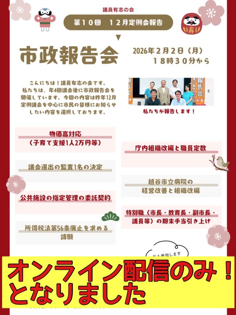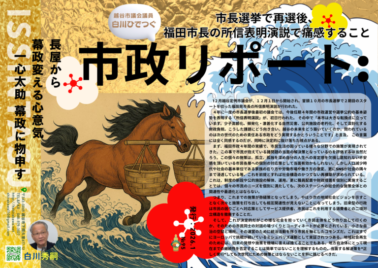 Re Design民主主義 対話から始めよう! 2023.01.192026.01.28 TikTok 読者会ニュース54号 2026.01.13 一心太助の天秤棒_2026年月-161号 2026.01.13 一心太助の天秤棒_2026年-160号 2026.01.13 読者会ニュース53号 2025.11.06 一心太助の天秤棒_2025年8月-159号 2025.11.06 活動毎日、毎朝の駅立ち(AM6:00~AM8:30)と定期的な夜の駅立ち(PM7:00~PM12:00)は23年目に入る。(通算4300日を超える)せんげん台東・西、大袋東・西、北越谷東・西、越谷東・西、新越谷東・西、蒲生東などを順次。市政報告会や政治課題等をテーマに市民を対象に随時タウンミーティングを開催し、130回を超える。市政レポート毎月作成、街頭、地域で配布。毎年新年3か日(元旦、2日、3日)は、越谷市一円で街頭市政報告会を新年あいさつを兼ねて開催。1年の活動のスタートとしている。当選以来実施しており、19回となる。市政レポートで日常活動を報告する「一心太助の天秤棒」(毎月発行し117号まで駅立ち等で配布)、年4回の議会終了後定期発行する「一心太助 幕政に物申す」(86号まで発行、配布)議会終了後超党派議員で構成する「議員有志の会」(7名)で市政報告会を提起開催。(2026年1月1日現在)役職「がんばろう、日本!」国民協議会同人ローカルマニフエスト推進地方議員連盟監事越谷総合技術高校PTAOB樟の木会会員中小企業家同友会会員埼玉政経セミナー 会員家族妻、2男、1女連絡埼玉県越谷市下間久里477-12048-979-3023221 昭和28年佐賀県に生まれる昭和50年福岡大学経済学部卒業。福岡県議事務所勤務昭和58年福岡市議会議員に29歳で立候補したが惜敗昭和62年福岡市議会議員(最年少当選)を一期勤める平成05年衆議院秘書として、日本新党細川政権を支え国会事務所で活動平成07年埼玉県に転居、保険代理店勤務平成11年越谷市議選挙に立候補、2,060票の支持を得たものの、5票差で次点となり落選平成13年岩槻タクシー乗務員。変則的勤務時間を活用しながら「がんばろう、日本!」国民協議会の一員として、主権者運動を始める。日本再生のエネルギーは、バッチをつけない主権者一人一人の小さき無償の戦いから生まれることを確信。平成15年越谷市会議員当選 1期目 2709票(13位)平成19年越谷市会議員当選 2期目・副議長 3253票(7位)平成23年越谷市会議員当選 3期目 3478票(3位)平成27年越谷市会議員当選 4期目 3805票(3位)平成31年越谷市会議員当選 5期目 4143票(4位) 一灯を掲げ一隅を照らす。暗闇を恐れることなく、一灯を保つ。自由、民主主義、開かれた市場経済、基本的人権という近代が勝ちとってきた普遍的価値を、自らのアイデンティティにまで高め、深化するためには、連続的戦いが伴います。○ この平成の開国倒幕という時代の荒波に漕ぎ出すエネルギーは、 国民主権の「草莽掘起」によって蓄積・発展し、政党政治の基盤を打ち固めます。○人口減少時代とグローバル市場に機敏に対応することが矜持ある日本を創造して行きます。○ 出でよ草莽の転轍手、国民主権のせり上がりのなかで、「保守したければ改革せよ」。 今私たちの社会は大きく変ろうとしています。ロシアのウクライナ侵攻は、遠い国の話ではなく、私たちのすぐ目の前にある脅威として、国の姿勢を問うています。新型コロナウィルス感染に対する対応も、社会構造の転換なしでは次のパンデミックは耐えきらないということを可視化しました。 政治家の活動も、変化の時を迎えています。 白川秀嗣は、マニフェストを「公約」ではなく、市民と語り合うための「コミュニケーションツール」「共通の地域課題のテーマ」とし、ネットを含めた様々なシーンで対話を続ける。その中から新しい社会を創るための新しい中間団体を生み出す中で、新しい地域社会の担い手が生まれることを確信しています。 新しい社会の新しい担い手をつくる未来のチェックリスト □ 多様性の中で生きる 「人権」「ジェンダー」の再定義 □ 貧困と格差 分断と不信の30年からの脱却 財政問題の根本を問う□ 市民自治の当事者意識を高める 政策決定の場への市民参加 コミュニティ推進協議会のあり方と機能を変える